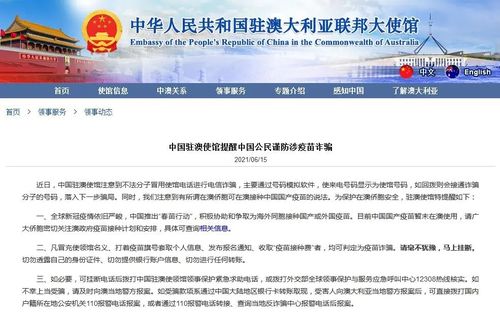 中国驻澳大利亚大使馆提醒民众防范疫苗诈骗。(网站截图)