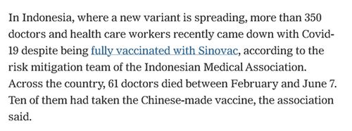 另外,黄瑞黎的文章中还存在着大量对事实的删减。比如她在文中提到印尼有350个注射了中国疫苗的医护人员感染了新的变异毒株,而且在2月到6月死亡的60个医生里,有10人注射过中国疫苗。然而,她并没有透露印尼一共有多少医护人员这一重要的参照数字,也没有透露这种变异毒株,正是连BNT疫苗应付起来也很困难的那种印度发现的德尔塔毒株。