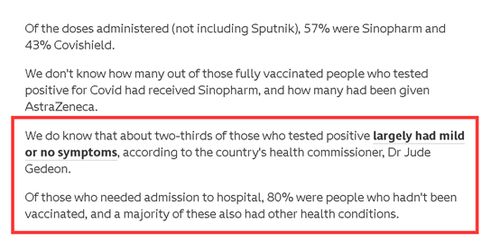 耿直哥还在一篇英国BBC关于塞舌尔疫情的报道中发现,地处非洲的塞舌尔之所以会疫情复燃,是因为该国遭到了最先在南非被发现的贝塔变异毒株的袭击。不过,由于塞舌尔政府一直在努力推进疫苗接种工作,这一轮疫情复燃中那些感染者有2/3的人只出现了轻微的症状,甚至没有症状。而那些需要住院的患者中,80%都是没有接种疫苗的。