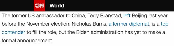 之后,CNN又展望了一下中美两国潜在的下任大使人选。美国方面,CNN称,曾在美国国务院外事处工作多年、担任过美国驻希腊大使和驻北约常驻代表的尼古拉斯·伯恩斯,被普遍视为是接任这一职务的人选。但拜登政府截止目前都没有正式宣布驻华大使的人选。
