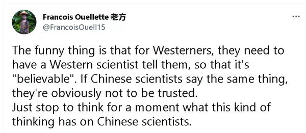 首先,是一位来自加拿大,目前居住在中国成都的学者“老方”,他在看到了彭博社这篇报道后,发出了这样一番感叹。他说,为什么中国科学家说什么,西方人都不会信,但找个西方科学家说一遍同样的事情,这样的话就会变得“可信”了呢?你们有没有想过中国科学家在看到这个场景后会怎么想?