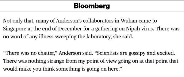 实际上,就连彭博社这篇采访了曾在武汉病毒所工作的澳籍科学家安德森,并呈现了她的说法的文章,也仍然被该报的编辑记者加入了不少宣扬那些抹黑武汉病毒所的阴谋论,或给这种阴谋论增添“合理性”的段落。