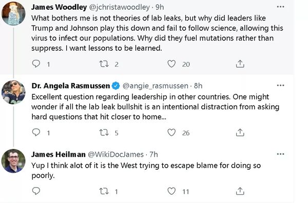 那些有良知的外国科学家和他们的支持人也表示,他们觉得美国和西方政府这么炒作武汉病毒所的阴谋论,是为了国内的转移矛盾和责任。