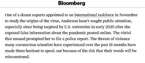 因此,在彭博社这样的西方媒体看来,安德森的这些工作背景,尤其是她在2019年下半年疫情暴发前夕这个时间节点在武汉病毒所工作过的经历,就令她的身份相当特殊了。