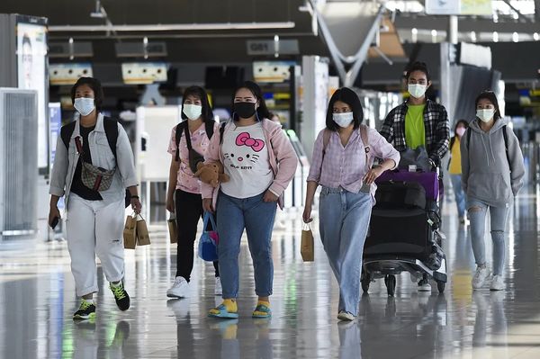 当地时间2021年6月27日,泰国首都曼谷,旅客佩戴口罩在素万那普国际机场办理值机手续。