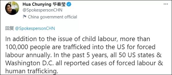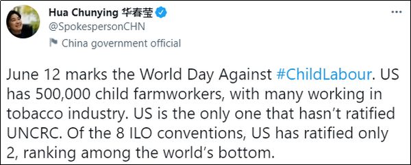 今年6月15日,中国外交部发言人华春莹在推特发文指出,美国有50万童工,其中许多在烟草行业工作。美国也是唯一一个没有批准联合国儿童权利公约的国家,而在国际劳工组织的8项公约中,美国只批准了2项,排名全球垫底。