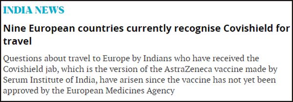 7月1日,BBC从消息人士处得到消息,奥地利、德国、斯洛文尼亚、希腊、爱尔兰和西班牙已批准,接种印度Covishield的旅行者被纳入欧盟“绿色通道”(green pass),可以在区域内自由通行。