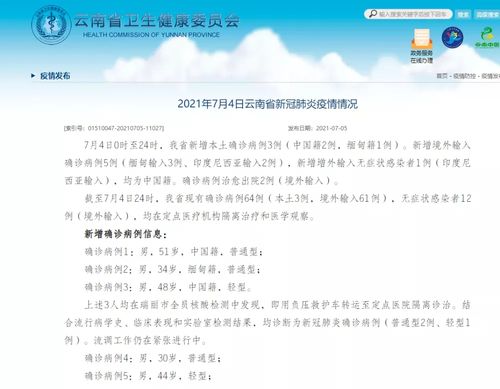 7月4日0时至24时,云南省新增本土确诊病例3例(中国籍2例,缅甸籍1例)。新增境外输入确诊病例5例(缅甸输入3例、印度尼西亚输入2例),新增境外输入无症状感染者1例(印度尼西亚输入),均为中国籍。确诊病例治愈出院2例(境外输入)。