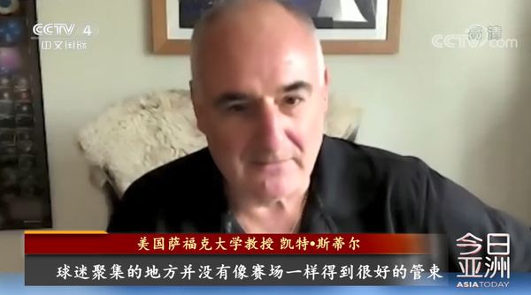 美国萨福克大学教授 凯特•斯蒂尔:可怕的是赛场管控得当,但全国都陷入狂热之中,球迷聚集的地方并没有像赛场一样得到很好的管束,这是很恐怖的。