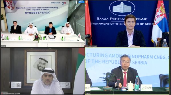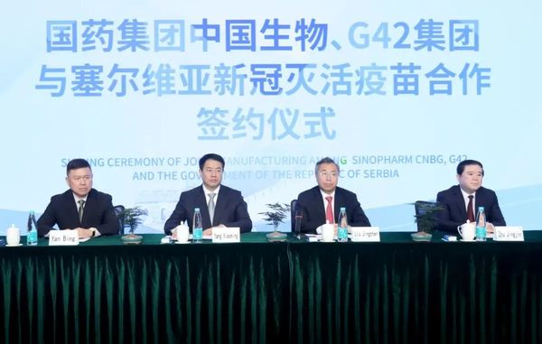 据国药集团微信公众号7月12日消息,国药集团中国生物 、G42集团与塞尔维亚 新冠疫苗合作签约仪式在中国北京、 阿联酋阿布扎比、塞尔维亚贝尔格莱德三地 以视频方式举行。 塞尔维亚总理阿娜·布尔纳比奇、国药集团中国生物董事长杨晓明、阿联酋G42集团CEO肖鹏代表三方共同签署新冠灭活疫苗合作备忘录,启动塞尔维亚新冠疫苗原液分装项目建设。塞尔维亚产新冠疫苗将会在本国疫情防控及全球共同战疫中发挥重要作用。