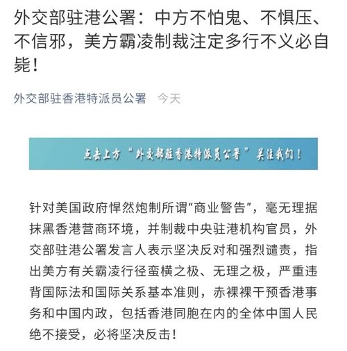 外交部驻港公署:中方不怕鬼、不惧压、不信邪,美方霸凌制裁注定多行不义必自毙!