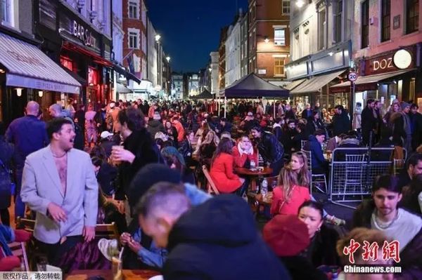 资料图:当地时间2021年4月12日,英国进入放松疫情封锁措施的第二阶段。据悉,酒吧解封的第一晚,伦敦大批民众在市中心喝酒跳舞,场面宛如狂欢节。