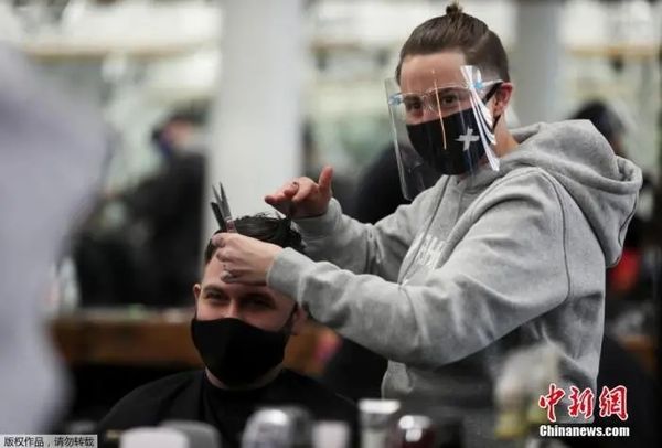 资料图:当地时间4月12日,英国纽卡斯尔一家理发店内,一名员工正在为顾客服务。
