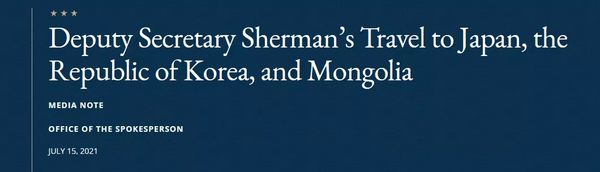 紧接着,7月15日,美国国务院在官网发布谢尔曼即将于7月18日至25日访问亚洲三国的消息。