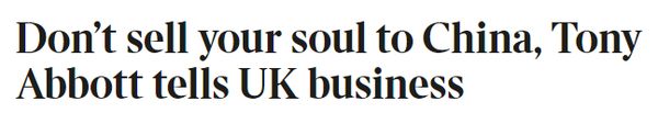 另据英国《泰晤士报》报道,阿博特在演讲中还敦促英国企业和其他机构减少对中国资金的依赖,不要向中国买家出售技术公司(例如芯片制造公司),“别把你们的灵魂卖给中国!”