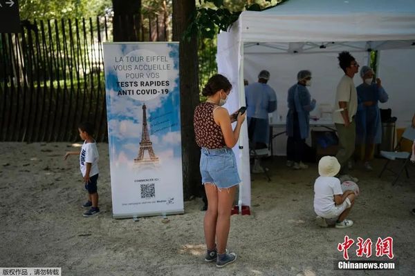 资料图:当地时间2021年7月21日,法国巴黎,游客在埃菲尔铁塔入口处进行新冠检测。