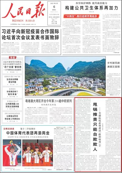 来源|人民日报(2021年08月06日 第1版)原题《甩锅推责只能自欺欺人——全球抗疫必须肃清“政治病毒”②》