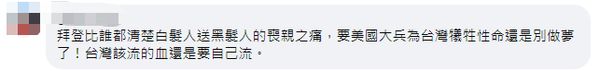 两岸关系的死结在哪,台当局比谁都清楚,但他们为了政治私利,不惜将全台民众绑上“台独”战车,幻想美国能“拉一把”,大不了“一跑了之”。但有网友一语道破真相,“拜登比谁都清楚白发人送黑发人的丧亲之痛,要美国大兵为台湾牺牲性命还是别做梦了!台湾该流的血还是要自己流。”