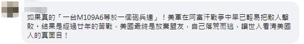 总的来说,各界普遍对此次军售的后果保持清醒看法。但在台湾岛内,执政的民进党当局及其附随组织沉浸在一片“乐观”氛围中,个别名嘴甚至吹嘘售台装备“一辆(车)相当于一个传统炮兵连的威力”,这引发岛内网友不满,反呛:“如果真这么厉害,美军早就在阿富汗战争中击败敌人,结果是抛弃盟友落荒而逃,让人看清美国真面目!”