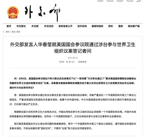 美国会参议院通过涉台参与世界卫生组织议案,外交部:已向美方提出严正交涉 外交部发言人华春莹就美国国会参议院通过涉台参与世界卫生组织议案答记者问。……