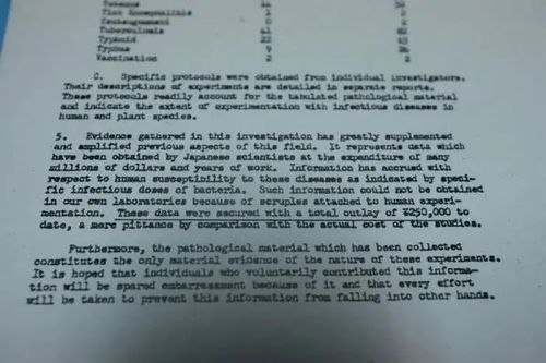 他们报告说,石井四郎等人非常配合,他们正在撰写大量报告,而且他们已经同意提供“8000多张经过生物武器实验后人类和动物尸体组织的照片”。他们指出,人体实验的效果要比动物实验好得多。他们指出,据判断苏联仅仅掌握“一小部分技术方面的信息”,由于“那些日本人受到战争罪行指控会导致数据被所有国家获取,为了美国的国家安全利益,必须尽力避免这种情况的发生”。他们还强调,日本人所掌握的实验数据“对美国自己的生物武器研究项目具有重要价值”,而且“日本实验数据对美国国家安全的价值极大,其重要性要远远超过战争罪行诉讼本身”。