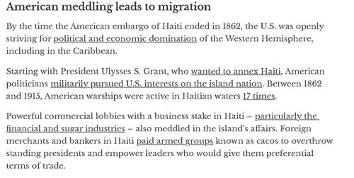 来自美国佛罗里达国际大学的海地历史学者Chantalle F. Verna就在多篇讲述海地历史的文章中介绍说,在19世纪中后期,希望成为西半球主宰的美国就开始不断通过商业和军事途径介入海地的内部事务,不少海地政局的动荡,就是这些美国的利益群体在花钱驱动的。当时的美国总统尤利西斯·格兰特,甚至还想吞并海地。