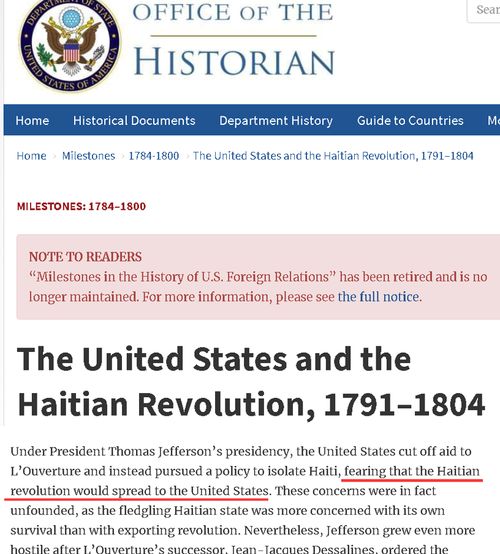 来自美国国务院官网上的历史资料就显示,在海地独立后,时任美国总统的托马斯·杰斐逊因为害怕海地的革命之火会蔓延到美国,便开始与法国殖民者一道在当时毫无任何公理正义可言的“国际社会”上“孤立”海地,不让欧洲国家及其殖民地与海地进行任何贸易交易。