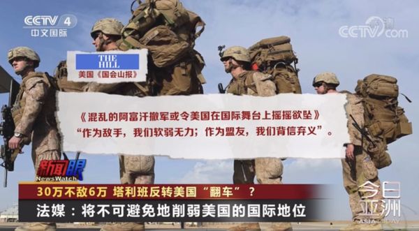 美国《国会山报》以“混乱的阿富汗撤军或令美国在国际舞台上摇摇欲坠”为题刊文,文章说“作为敌手,我们软弱无力;作为盟友,我们背信弃义”。