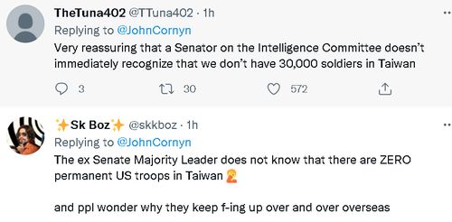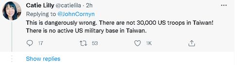 而且,即便已经有很多人在约翰·科尼的这则贴文下追问和质疑他关于美国在台湾驻军的数据是否准确,或是不断提醒他“台湾并没有美国驻军”、“这么说很危险”,截至耿直哥撰写此文时,他都没有删除这则贴文。