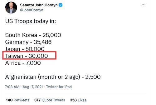 虽然他的贴文主要是想说明美国在阿富汗的驻军很少,只有2000人,远不如美国在韩国、日本、德国乃至非洲等地的驻军人数——可让人吃惊的是,根据他的说法,美国居然在中国台湾省还有着多达3万的驻军!