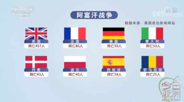 据美国政治新闻网站报道,欧洲国家为阿富汗战争投入的资金很难精确计算,仅英国在2001至2014年期间就为阿富汗战争投入约210亿英镑。阿富汗战争中,英国阵亡457人,法国阵亡86人,德国阵亡59人,意大利阵亡53人,丹麦阵亡43人,波兰阵亡40人,西班牙阵亡34人,罗马尼亚阵亡25人。
