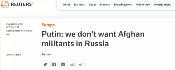 俄罗斯又表态了。路透社消息,俄总统普京22日在对统一俄罗斯党领导人讲话中,反对将阿富汗民众撤离到俄罗斯周边国家。他表示,“不希望武装分子以难民的名义出现在这里”,阿富汗局势直接关系到俄罗斯的安全。针对一些西方国家将部分阿富汗难民转移至邻近中亚国家的提议,普京发出连环拷问。