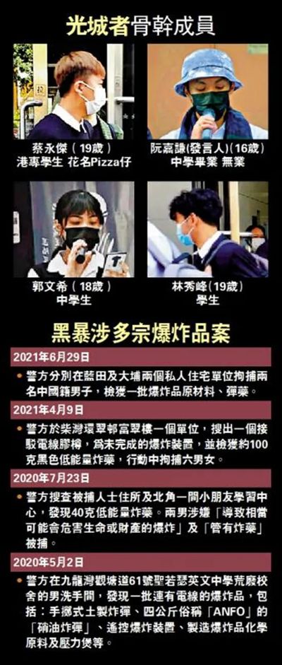 几天后,香港警方在尖沙咀捣破一个爆炸品实验室,拘捕了9名犯罪嫌疑人。该实验室由“港独”组织“光城者”所有。