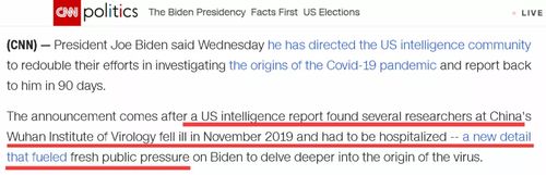 (图为CNN在报道中称拜登启动对武汉病毒所的“90天”调查是因为美国情报部门“发现”了武汉病毒所11月有人得病住院这一“新信息”)