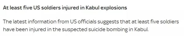 英国“天空新闻”刚刚援引来自美国官员的最新信息称,至少有5名美国士兵在喀布尔机场外发生的爆炸事件中受伤。