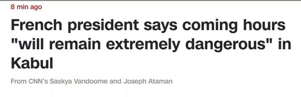 美国有线电视新闻网(CNN)刚刚消息,法国总统马克龙表示,喀布尔接下来几个小时仍然“极其危险”。