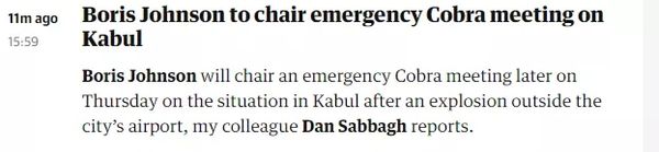 英国《卫报》刚刚消息,首相约翰逊将于当地时间26日晚些时候主持一场紧急会议,讨论喀布尔机场外爆炸事件。