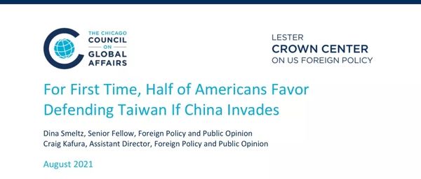 之所以能引起关注,很大程度上是因为这份民调有个很标题党的名字,这份来自“芝加哥全球事务委员会”智库的民调声称,首次有半数美国人赞成在“中国入侵”时捍卫台湾。