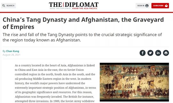 提出这个奇葩理论的,是“外交学者”网站的一篇名为《唐朝与阿富汗:帝国坟场》的文章。作者以唐王朝和突厥汗国边境战争史为背景,指出唐军曾攻打至今阿富汗境内,并在当地设立过地方政府机构。随后,作者又提到唐王朝后期因安史之乱导致国力衰弱,失去了对西亚地区的控制的历史。