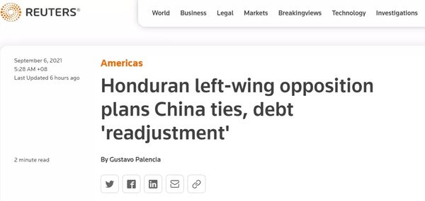 报道提到,洪都拉斯目前与台湾地区有“外交关系”,但卡斯特罗表示,如果在大选中获胜,将“立即开放与中国大陆的外交与商业关系”。