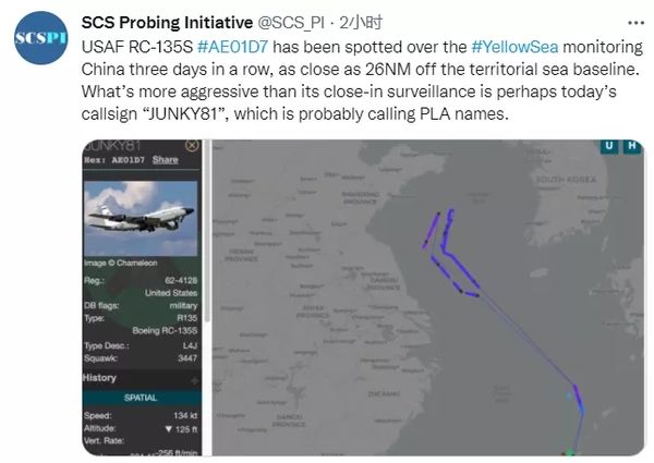 美军导弹监视机被曝连续3天在黄海侦察,还在呼号上使用含贬义的词,针对解放军耍心机!