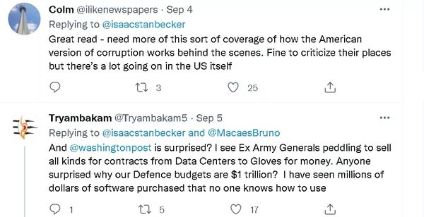 最后,在《华盛顿邮报》的这篇报道发布后,有美国网民表示,美国媒体早就应该关注这位美军将领去企业捞钱这个“腐败”问题了,而不是等到如今狼狈地撤军才想到这个话题。
