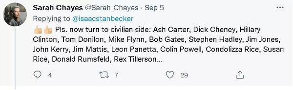 还有美国网民表示,除了这些在阿富汗担任过指挥官的将军,那些在过去20年里负责过阿富汗战争的美国政府官员,尤其是美国的前总统、前副总统、前国务卿和前国防部长也应该引起公众的质疑。因为这些人也和这些将军一样,在通过出书、讲课、或在企业、高校与智库任职,赚取了大量的金钱。可这些人真的“配”吗?