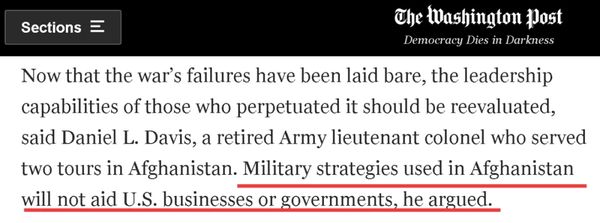 而一位也曾在阿富汗服役、现已退休的美军陆军中校则直白地认为,鉴于阿富汗战争的“失败”已经人尽皆知,他认为应该对当年领导过这场战争的将领的能力进行重新评估。这位名叫丹尼尔·戴维斯(Daniel L. Davis)美国军官还尖锐地表示,这些在阿富汗担任过指挥官的美军将领的军事策略,将不会给美国企业或政府带来帮助。