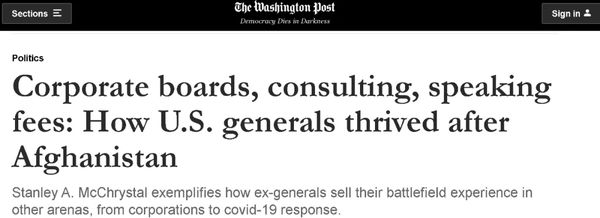根据《华盛顿邮报》的介绍,这些美军的将军们,有的正在私营企业当董事或高级顾问,用自己“战场上的经验”指引着这些企业“走向胜利”,有的则高薪被大学或智库聘请,兜售着他们在阿富汗的“成功学”。