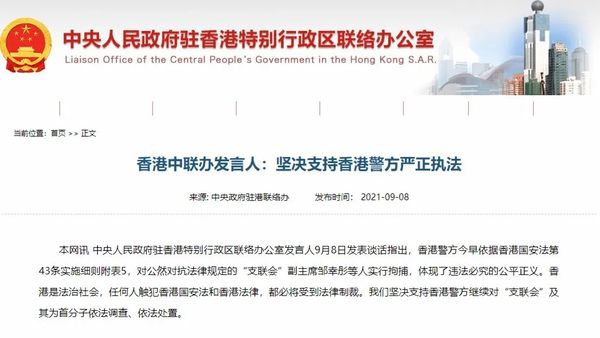 针对香港警方今早对公然对抗法律规定的“支联会”副主席邹幸彤等人实行拘捕一事,中央人民政府驻香港特别行政区联络办公室发言人9月8日发表谈话指出,这体现了违法必究的公平正义:
