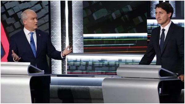 当地时间8日晚,魁北克省加蒂诺市,加拿大大选5个主要政党的党首举行法语电视辩论。守在屏幕前的选民,目睹了特鲁多遭到以保守党党魁奥图尔为首的对手猛烈围攻。
