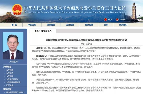 中国驻英国使馆发言人就英国议会跨党派中国小组有关活动推迟举办事答记者问