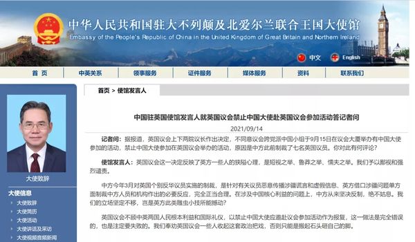 中国驻英国使馆发言人就英国议会禁止中国大使赴英国议会参加活动答记者问
