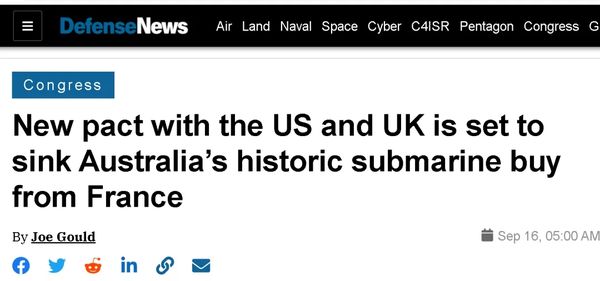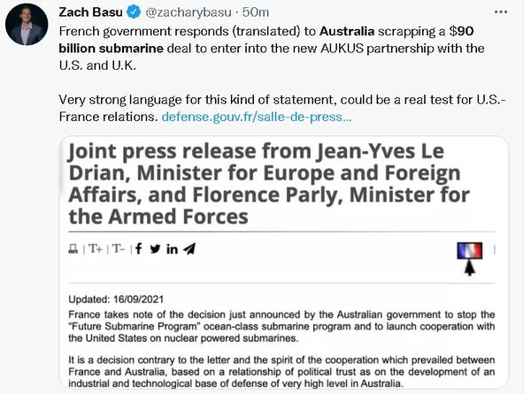 但法国方面对此事的回应是极为强烈的。美国Axois新闻网的记者Zach Basu贴出的一份法国政府措辞严厉的声明显示,法国方面认为美国将法国这一欧洲盟国排除在这一合作之外的举动是令人“遗憾”的,不仅伤害了法国与澳大利亚的互信,更证明了欧洲需要独立于美国的防卫政策。